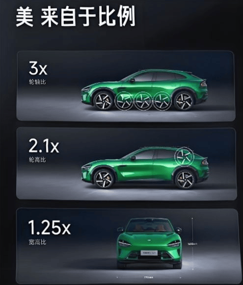 回到雷軍的描述,因為YU7契合了3倍輪軸比、2.1倍輪高比以及1.25倍寬高比,所以這車非常完美,怎么看也都是怪怪的。