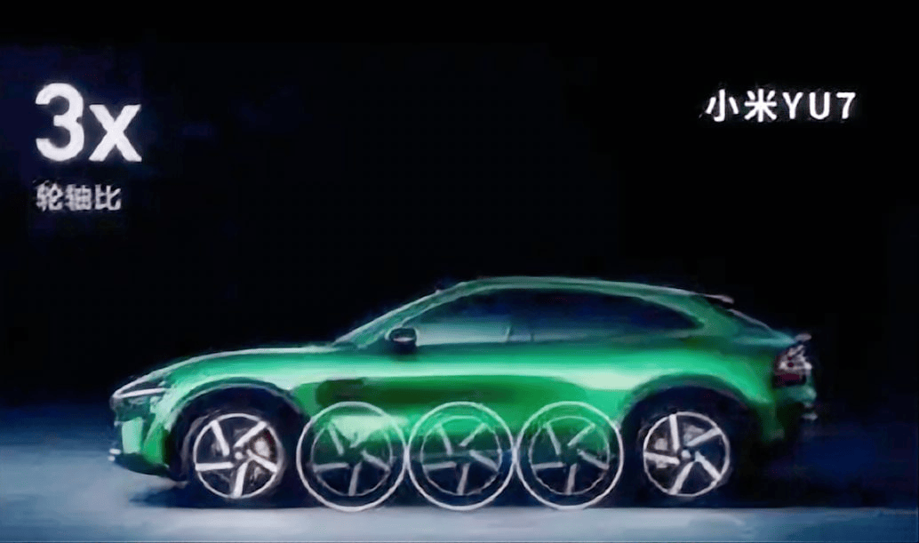 首先,輪軸比這個概念,其實是雷軍第一次提出來的。小米的官方PPT也做了展示,在小米YU7的前后輪之間,塞進(jìn)了3個輪胎,這大概就是雷軍“3倍輪軸比”的由來。