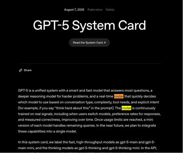 而OpenAI伴隨著GPT-5發布第一次與用戶見面的“路由(routing)”功能,設計本意也是代替用戶來把簡單問題匹配到低消耗模型,復雜問題匹配到能力和算力消耗高的推理模型,從而有效提升用戶體驗和算力效率,但卻變成AI圈最知名的“降本增笑”事件。