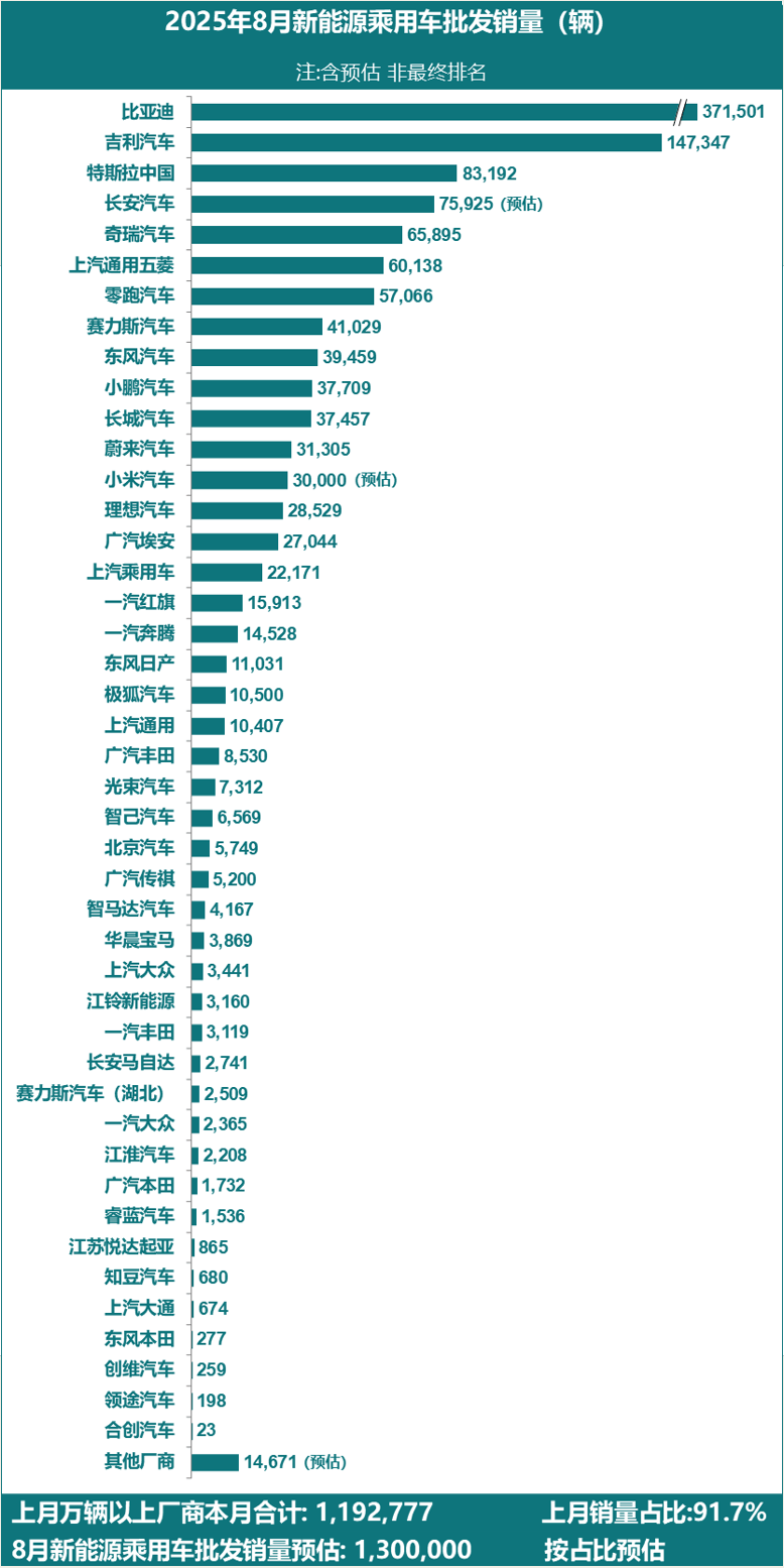 根據(jù)乘聯(lián)分會(huì)數(shù)據(jù),全國(guó)乘用車市場(chǎng)7月新能源批發(fā)銷量萬(wàn)輛以上的廠商銷量之和,占總體新能源乘用車當(dāng)月銷量的91.7%。根據(jù)月初匯總數(shù)據(jù),這些廠商的8月銷量為119萬(wàn)輛。目前絕大部分廠商銷量基本都已經(jīng)鎖定,因此按照上月結(jié)構(gòu)占比結(jié)合本月數(shù)據(jù),測(cè)算8月的全國(guó)新能源乘用車批發(fā)銷量為130萬(wàn)輛,同比增長(zhǎng)24%,環(huán)比增長(zhǎng)10%。