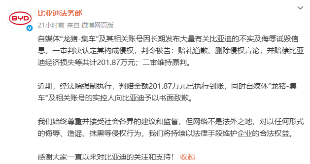 近期,經(jīng)法院強(qiáng)制執(zhí)行,判賠金額201.87萬(wàn)元已執(zhí)行到賬,同時(shí)自媒體“龍豬-集車”及相關(guān)賬號(hào)的實(shí)控人向比亞迪予以書面致歉。我們始終尊重并接受社會(huì)各界的建議和監(jiān)督,但網(wǎng)絡(luò)不是法外之地,對(duì)于任何形式的侮辱、造謠、抹黑等侵權(quán)行為,將持續(xù)以法律手段維護(hù)企業(yè)的合法權(quán)益。