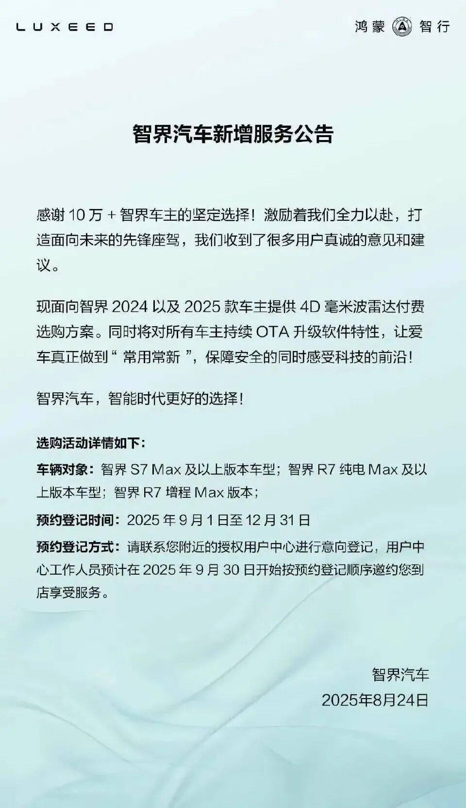 2025年8月,智界R7為車主提供4D毫米波雷達的付費升級方案;緊接著的是,2025年10月,問界汽車為2024款問界M9用戶推出了華為ADS小藍燈的付費升級服務。