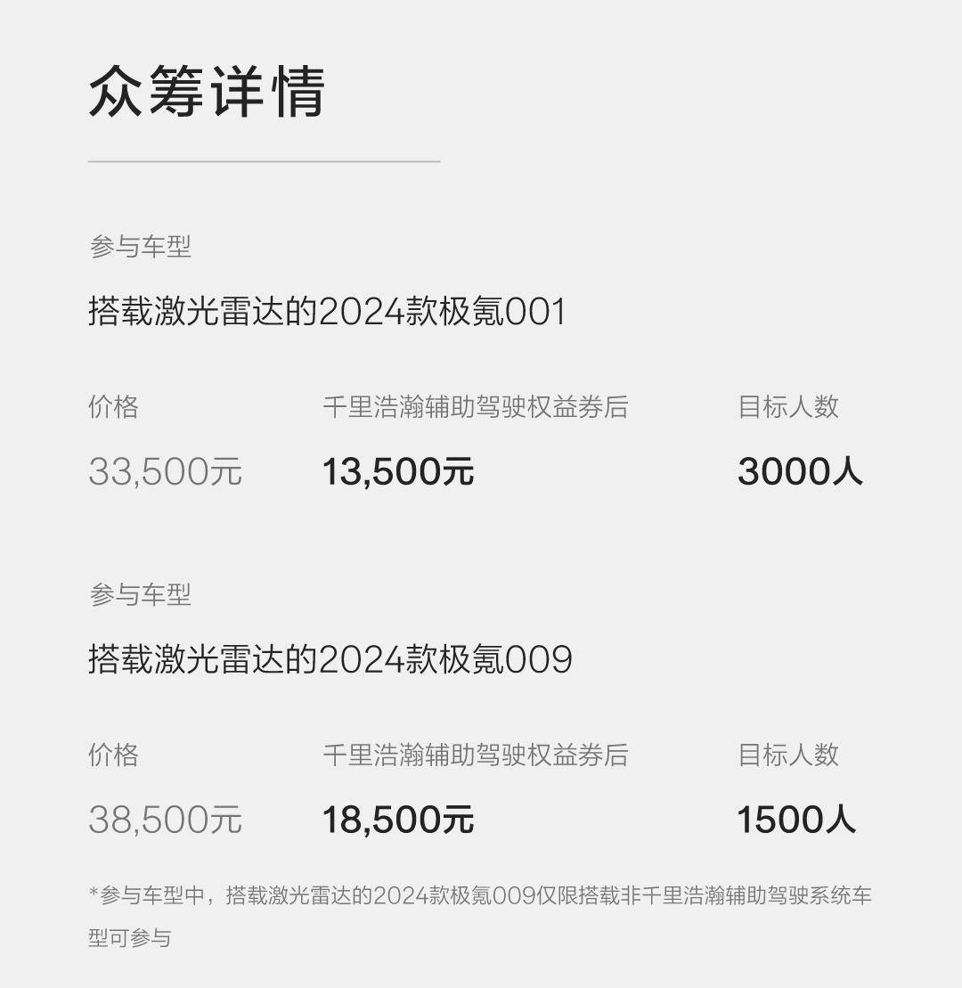 海報上顯示,極氪001車型的眾籌價格為1,500元,需達到3000名參與者方可成行;極氪009車型定價18500元,需要1500名車主參與。根據官方說法,光是前期研發,極氪就砸進去接近2個億,平均到每輛車上,硬件成本超過3萬元。