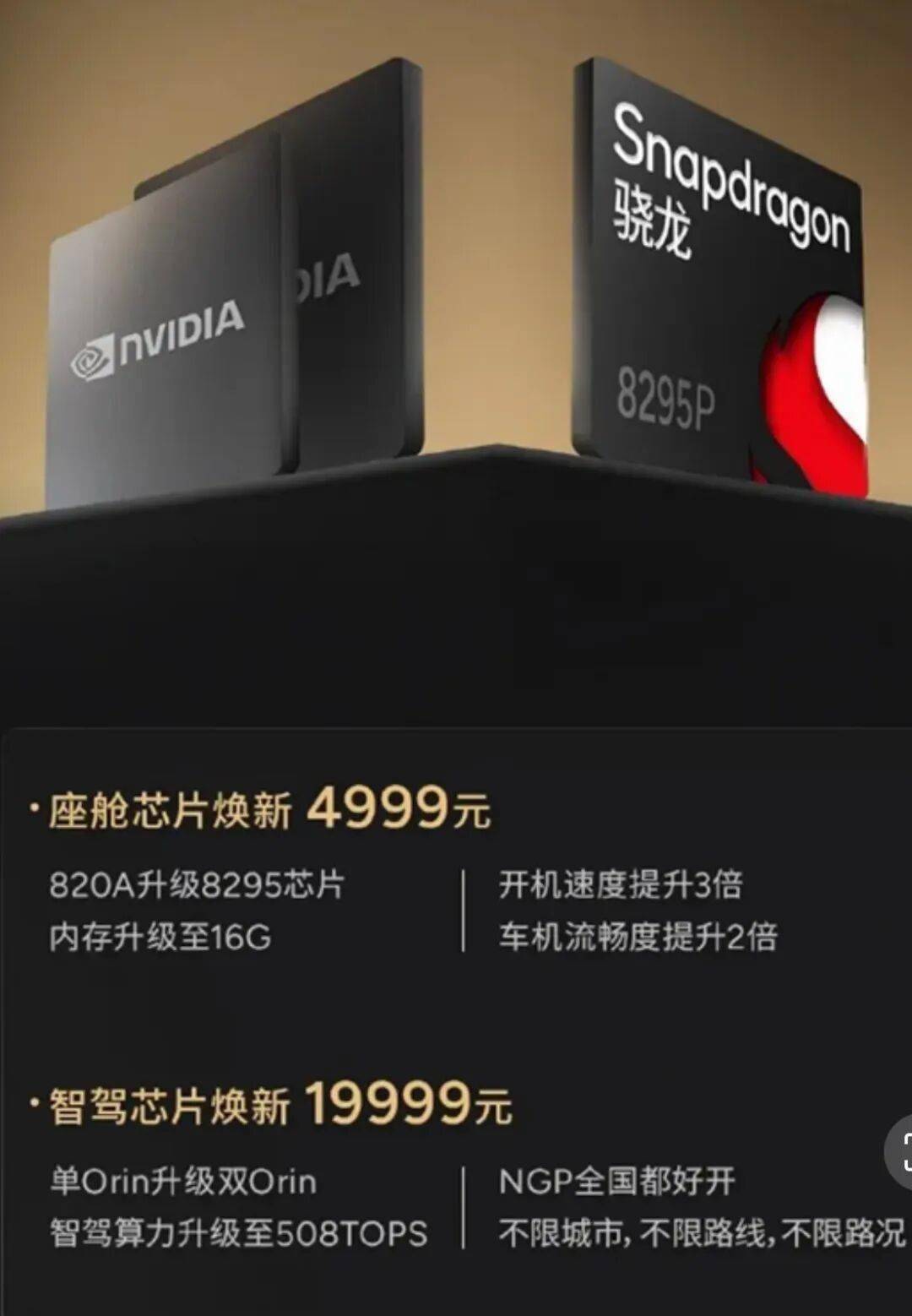 小鵬是種子選手。2024年11月,小鵬汽車宣布,啟動芯片升級眾籌,眾籌達到目標數量,即可啟動該車型煥新籌備。其中,智能座艙芯片由原來的驍龍820A升級至驍龍8295P芯片,內存也同步升級至16GB;智駕芯片由原來的單Orin芯片升級為雙Orin芯片,智駕算力翻倍,達到508TOPS。