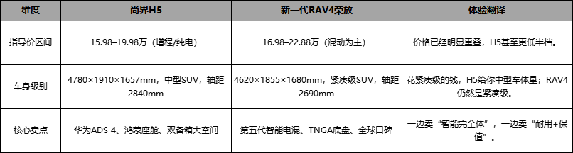 你買尚界H5,是在押注“未來體驗(yàn)”;你買RAV4榮放,是在續(xù)費(fèi)“過去十年的確定性”。看重哪一邊,就選誰。
