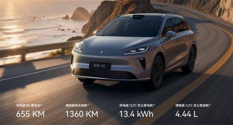 尚界H5:增程版15.98萬起,純電版16.58萬起,全系上來就給你中型SUV的車身、鴻蒙座艙,增程版綜合續(xù)航1360km、油耗4.44L/100km。