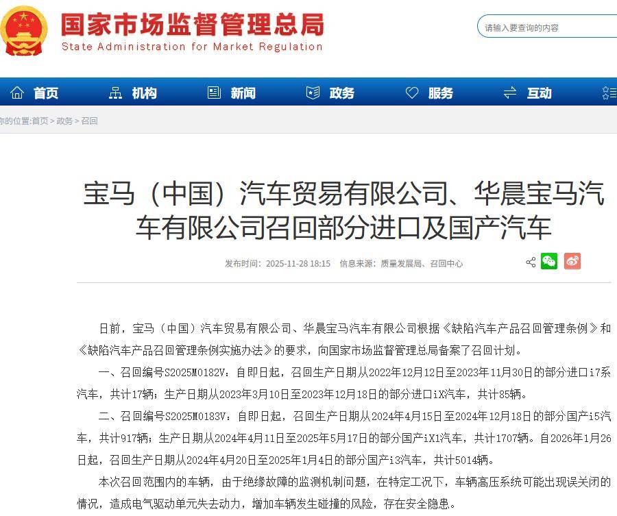 11月28日,國家市場監(jiān)督管理總局發(fā)布消息,寶馬汽車召回多款電動汽車,含i7/iX/i5/iX1/i3,主要原因電氣驅(qū)動單元存在失去動力風(fēng)險。
