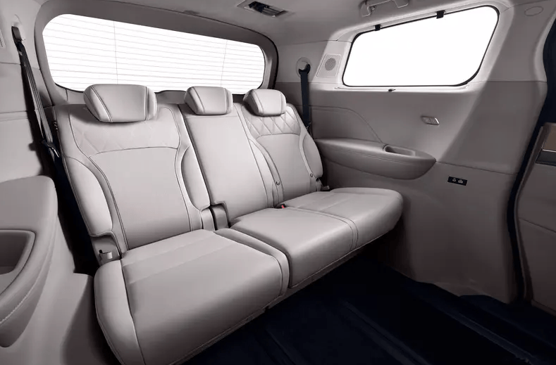在舒適性配置上,增加了HUD抬頭顯示,座椅升級為真皮材質,提供主副駕腰部支撐調節。前排座椅配備按摩功能和駕駛位頭枕揚聲器,第二排座椅新增按摩功能,還提供了后排小桌板,第三排座椅可電動調節。同時,揚聲器數量和氛圍燈也得到了升級。
