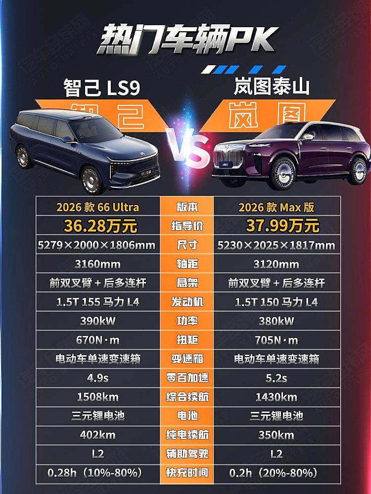 智己LS9 2026款66 Ultra售價為36.28萬元,嵐圖泰山2026款Max售價為37.99萬元,兩款車售價比較接近,定位也基本上是大同小異,但在產(chǎn)品層面各有千秋,那么哪一款車更加值得入手呢?