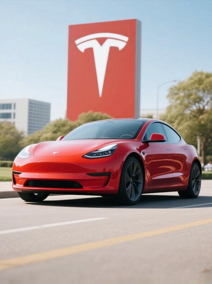 紅色特斯拉Model 3汽車 · 紅色特斯拉Model 3行駛在戶外,背景有特斯拉標識牌