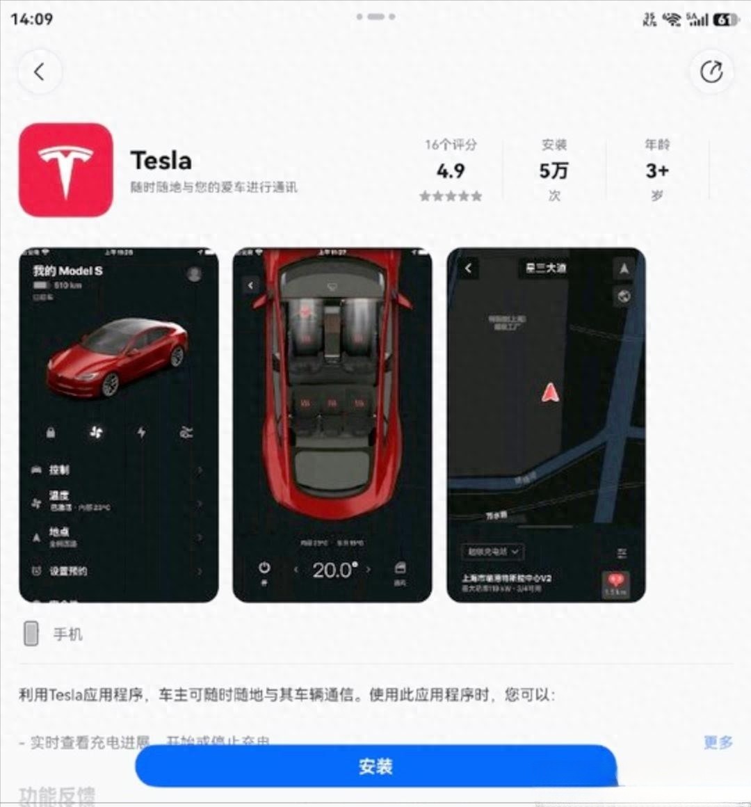 華為應用市場的特斯拉App頁面 · 展示特斯拉App評分、安裝量及功能界面