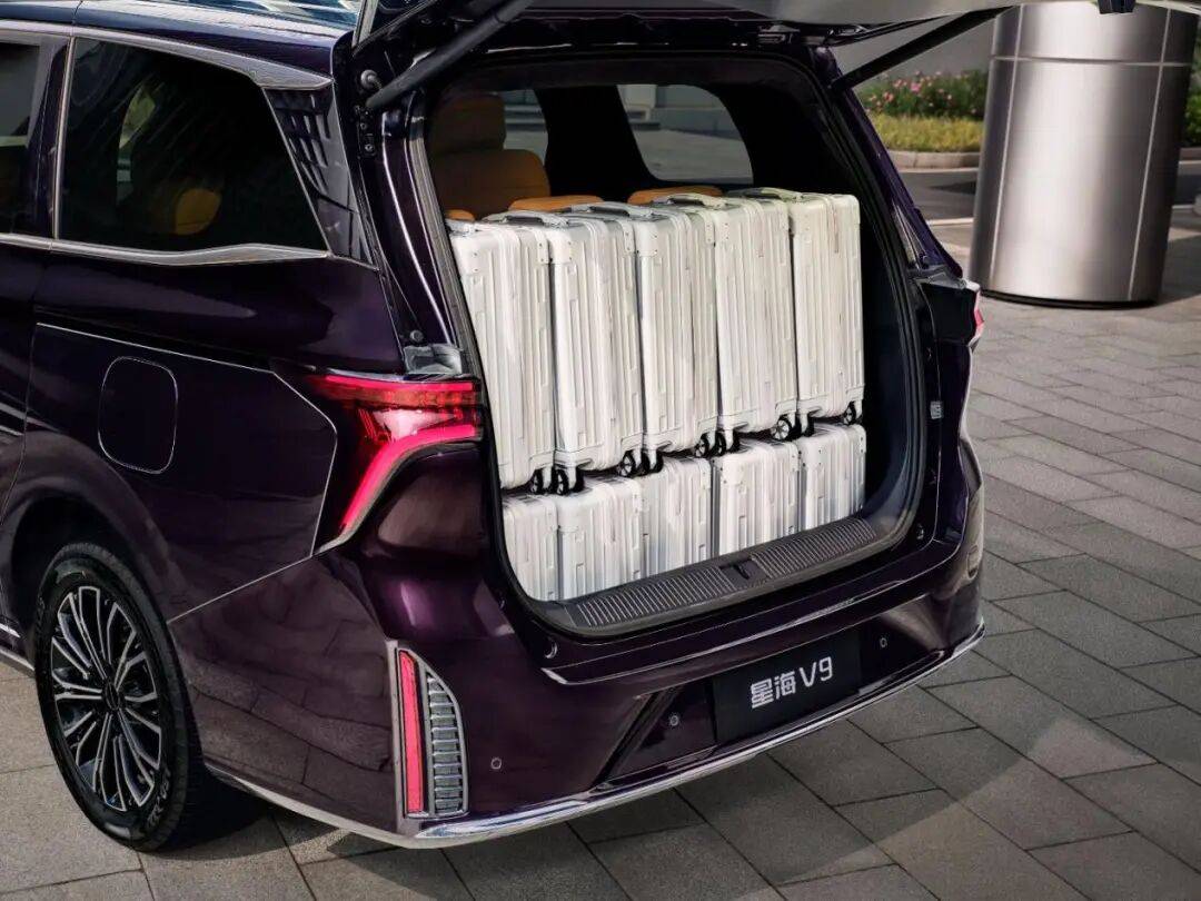 但星海V9給出了不同的解決方案:同級唯一第三排4/6分下沉式放平設計。常規七座狀態下,后備箱容積593L,7個20寸行李箱+7個背包綽綽有余;需要拉大件時,將第三排完全下沉,容積瞬間拓展至2616L——嬰兒車、露營帳篷、燒烤架、甚至一輛折疊自行車都能輕松吞下。更妙的是,下沉后形成一個1.7米長的純平地臺,跑長途累了可以鋪上氣墊當臨時小憩空間,這個“一車多用”巧思是相當優秀。
