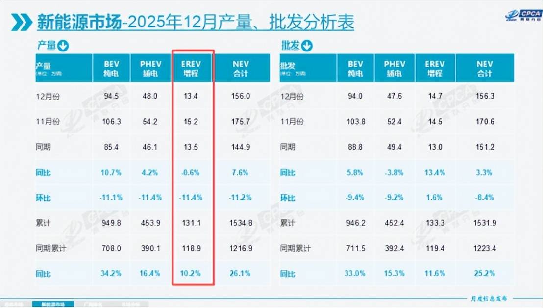 從乘聯會的數據中可以看出,在2025年,增程車累計銷量達131.1萬輛,同比增速僅為10.2%,而純電車型的銷量達949.8萬輛,同比增長高達34.2%。