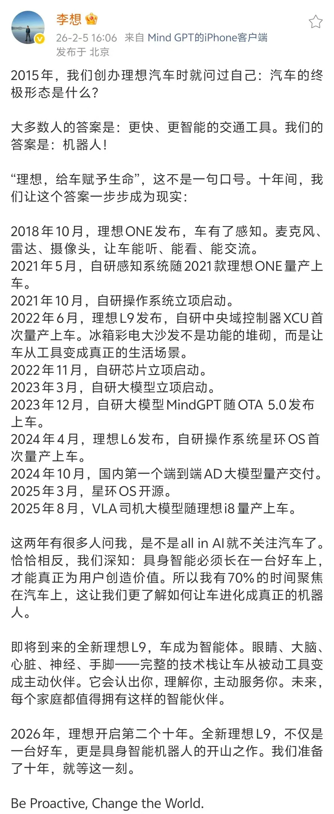 2月5日,理想汽車CEO李想發布長文,對全新理想L9進行預熱。李想表示,汽車的終極形態是機器人。all in AI并非不關注汽車,具身智能必須長在一臺好車上,才能真正為用戶創造價值。“所以我有70%的時間聚焦在汽車上,這讓我們更了解如何讓車進化成真正的機器人。”